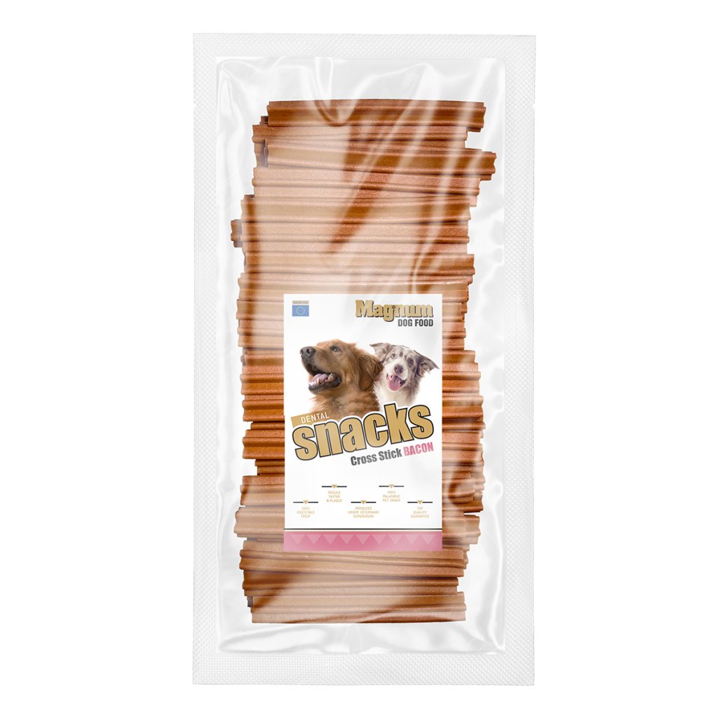 Magnum Cross Stick Natur je poloměkká přírodní křížová tyčka Jerky z kuřecího masa jako výtečný dentální pamlsek pro všechny psy, který se snadno dělí na menší kousky.